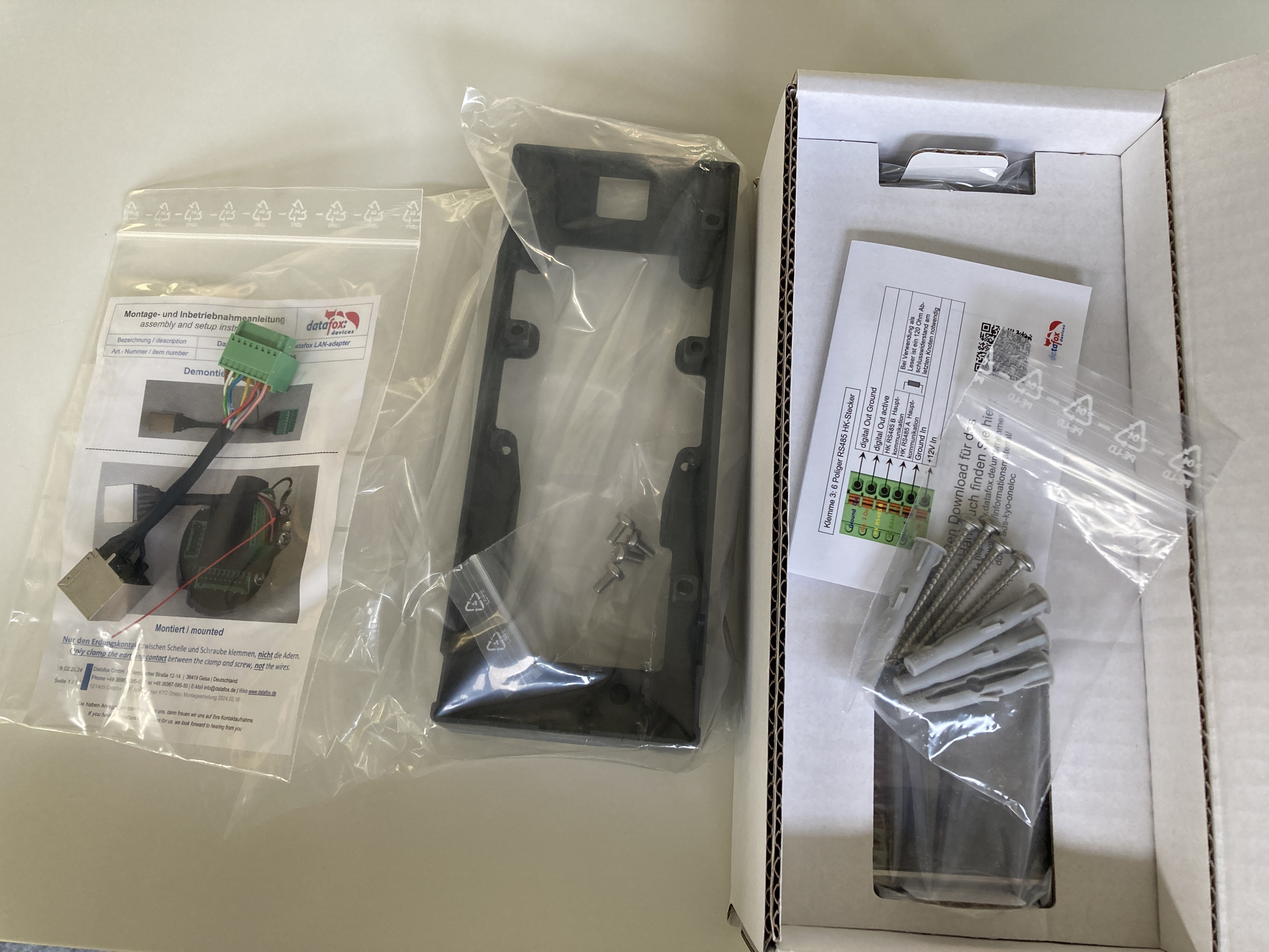 Inhalt prüfen: Terminal(s), Montagerahmen, PoE-Adapter, Box (Dormakaba)