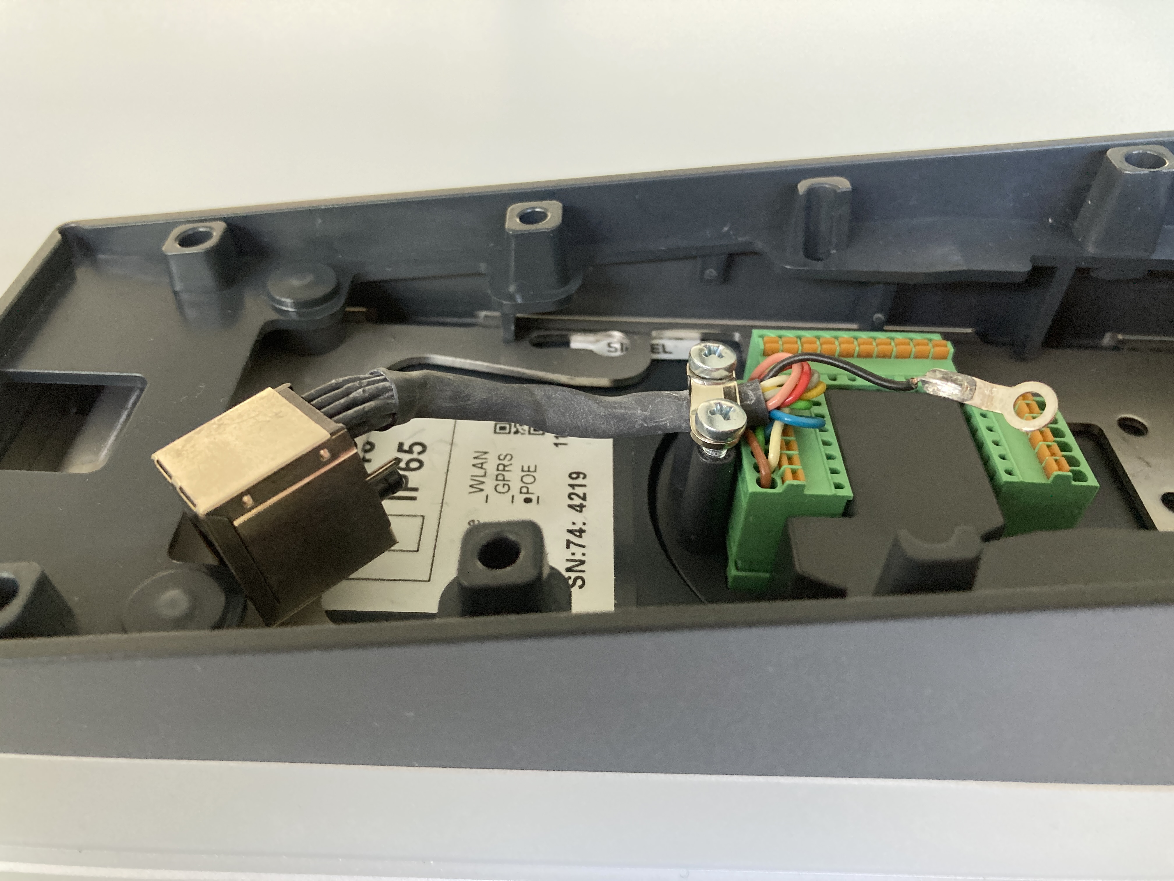 Der PoE-Adapter kann bereits am Terminal angeschlossen sein. Je nach Abschirmung des Ethernet-Kabels wird die Abschirmklemme entweder am Adapter oder an der Zugentlastung befestigt.