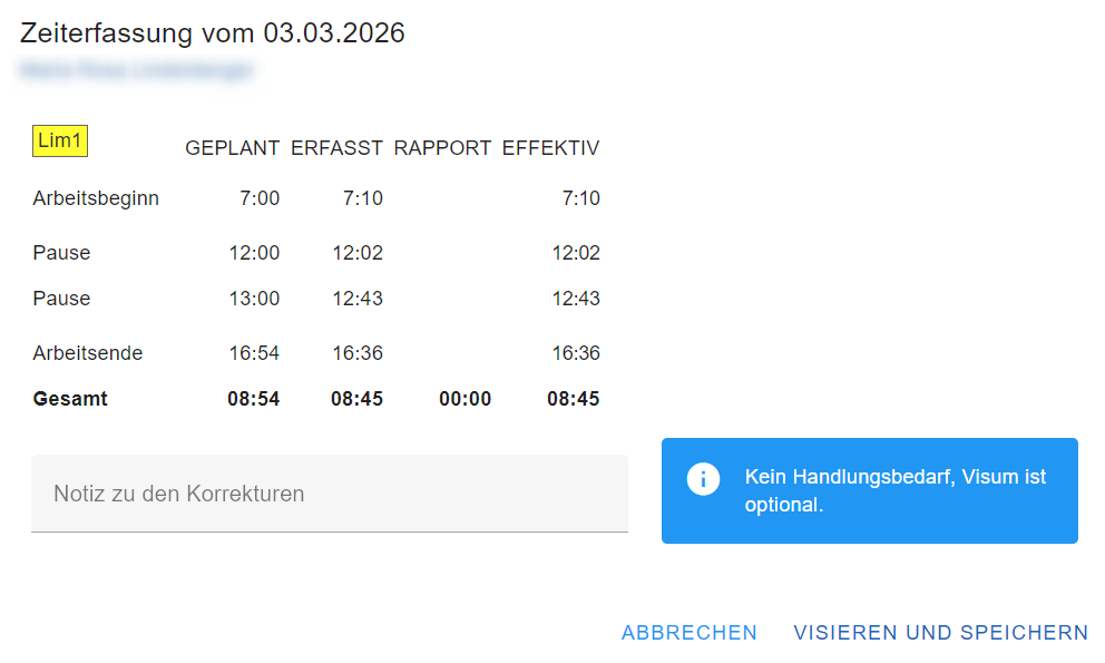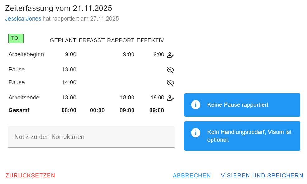 Der Hinweis dient nur als Information. Jedoch ist zu beachten, dass diese Zeiterfassung nur manuell visiert werden kann und nicht über ALLES VISIEREN.