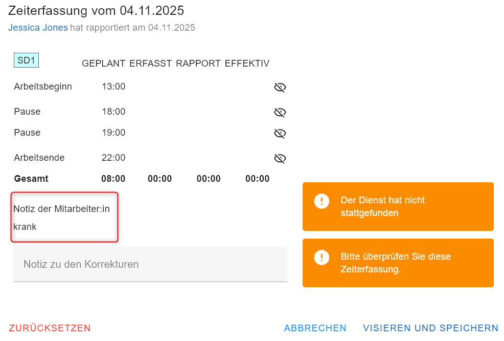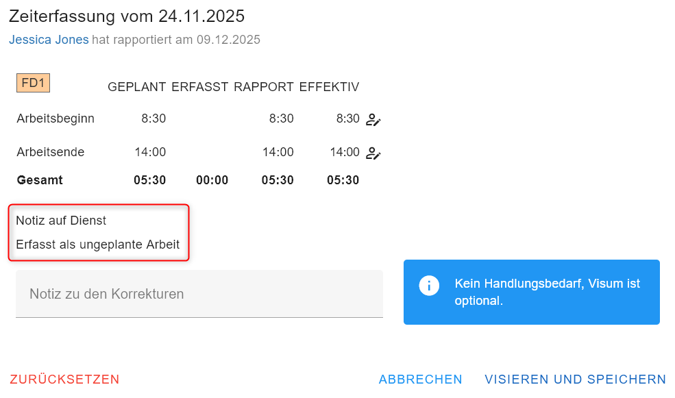 In diesem Fall muss die planende Person die Zeit des Dienstes auf dem Dienstplan anpassen. Anschliessend sollte die gestempelte Zeit korrekt interpretiert werden. Das visieren ist nun möglich.