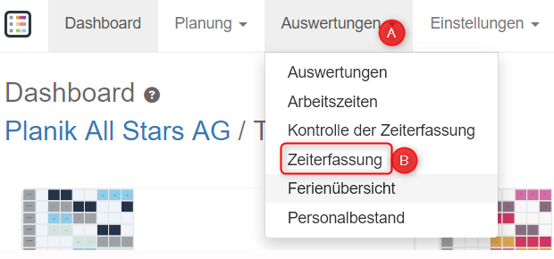 Unter Auswertungen (A) > Zeiterfassung (B) öffnet sich die Übersicht der Zeiterfassung.