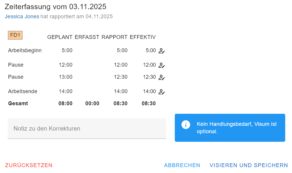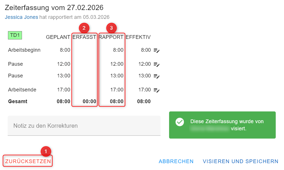 Die Zeiterfassung wurde von der plandenden Person genehmigt und visiert. Um nachträgliche Änderungen vorzunehmen, muss die Zeiterfassung zurückgesetzt (1) werden.