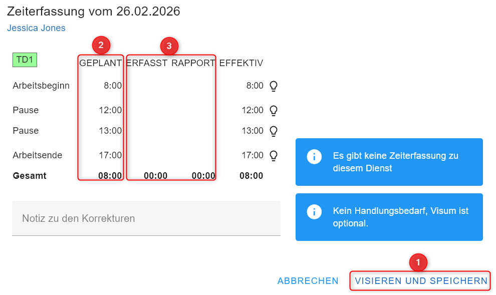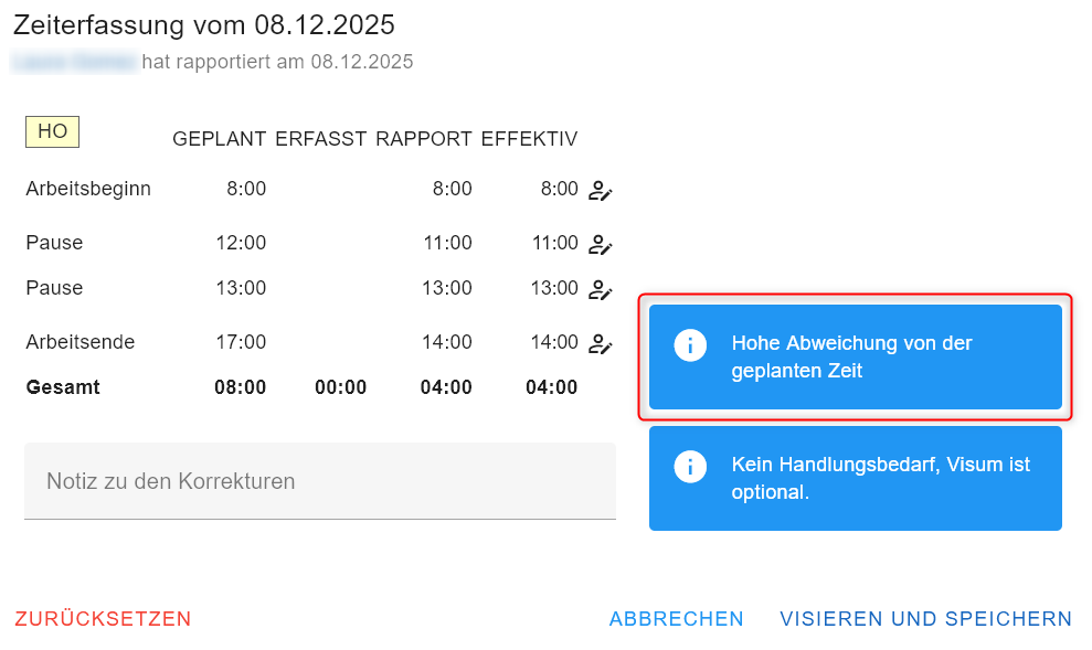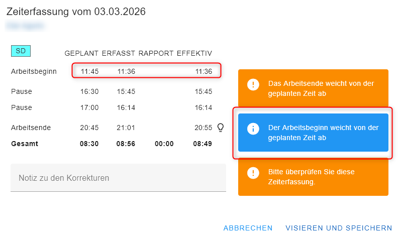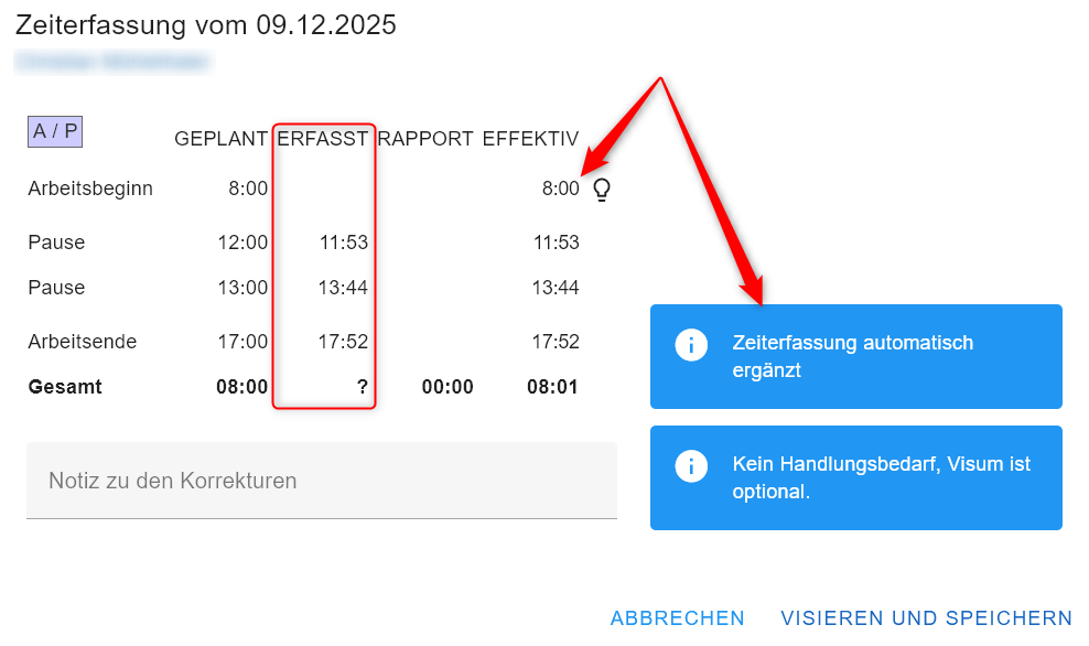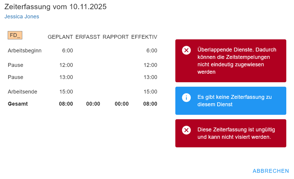 Der Hinweis dient nur als Information. Jedoch ist zu beachten, dass diese Zeiterfassung nur manuell visiert werden kann und nicht über ALLES VISIEREN.