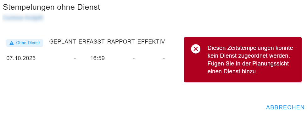 Planende müssen nachträglich einen Dienst im Dienstplan einplanen. Anschliessend kann die Stempelung zugeordnet und visiert werden. - Zeiterfassung über das Terminal wird nicht als Teil eines bestehenden Dienstes interpretiert.