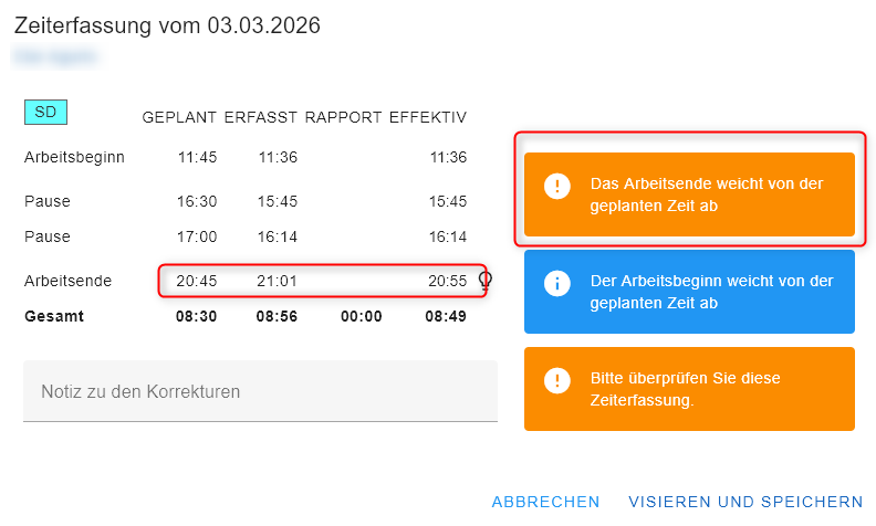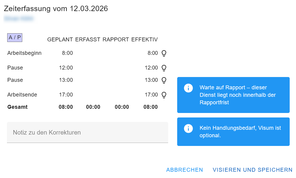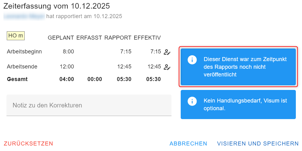 In diesem Fall muss die planende Person die Zeit des Dienstes auf dem Dienstplan anpassen. Anschliessend sollte die gestempelte Zeit korrekt interpretiert werden. Das visieren ist nun möglich.