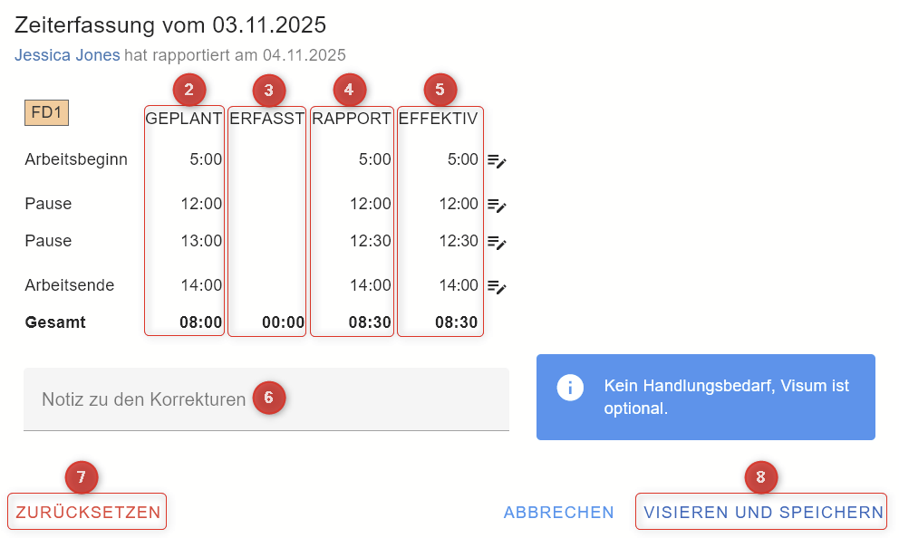 (8) Über VISIEREN UND SPEICHERN wird die rapportierte resp. erfasste oder angepasste Arbeitszeit visiert.