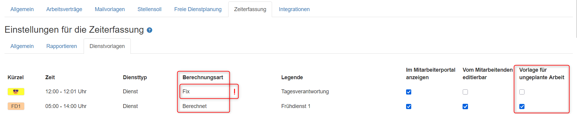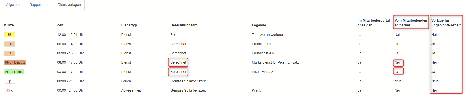 Prinzip dahinter: geplanter Dienst bleibt zur Nachverfolgung mit Arbeitszeit 00:00 ersichtlich. Abwesenheitsdienst wird mit Arbeitszeit hinterlegt, damit Mitarbeitende auf ihre Stunden kommen.