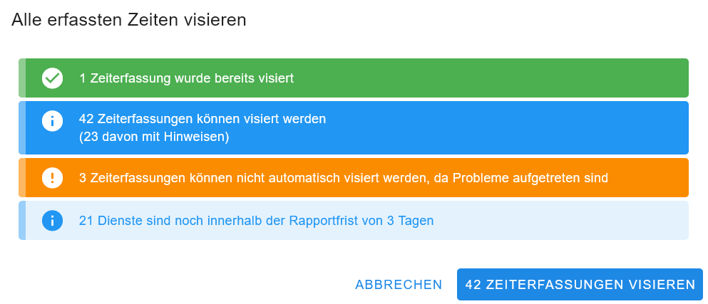 Zeiterfassungen stehen bereit zum Visieren: Sie verstossen nicht gegen die Konfiguration der Zeiterfassung.