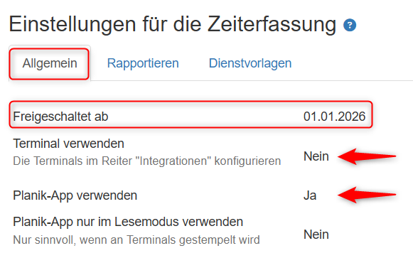 Im ersten Reiter Allgemein ist ersichtlich ab wann die Zeiterfassung und welche Version freigeschaltet wurde:
