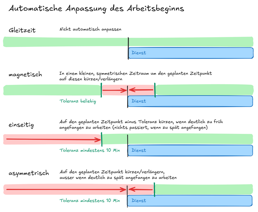 Mit der Einschnappzeit wird der Beginn- und/oder Arbeitsende auf die gewünschte Zeit eingeschnappt. Dabei wird zwischen zwei Strategien unterschieden: magnetisch (vor und nach dem Dienst) oder einseitig (vor oder nach dem Dienst). Toleranz beliebig